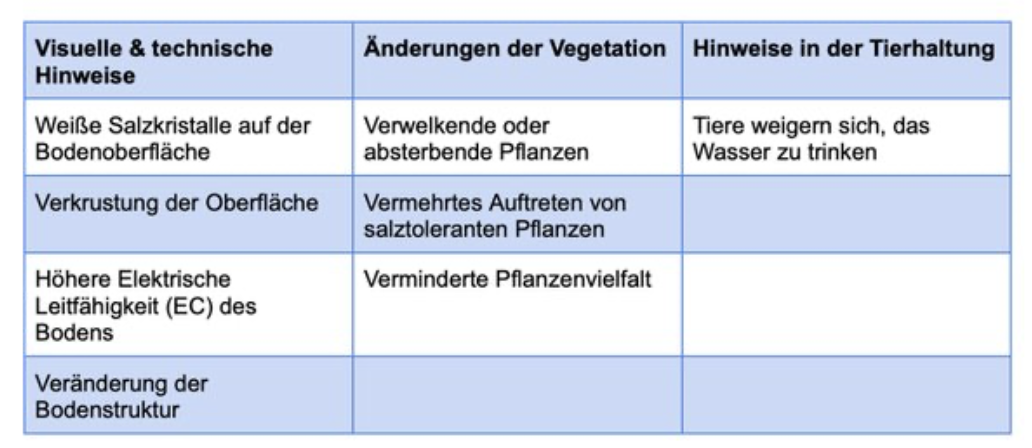 - Wasserqualität: Salzhaltige Böden können zur Versalzung von Grund- und Oberflächenwasser beitragen, was die Wasserqualität beeinträchtigt und negative Auswirkungen auf die lokale Flora und Fauna hat.