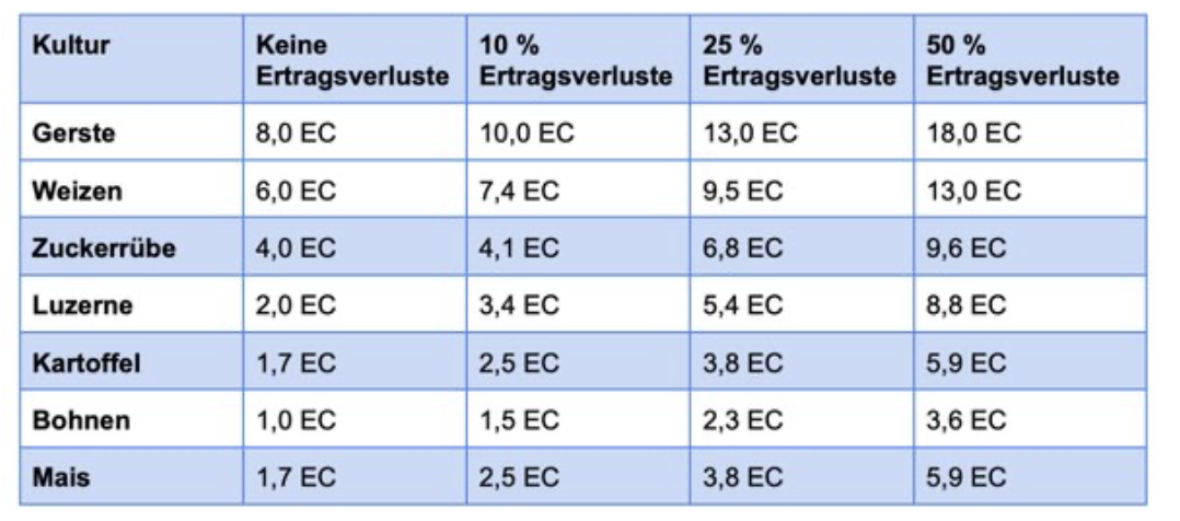 In der folgenden Tabelle aus einer Studie der Oregon State University sind die zu erwartenden Ertragsverluste verschiedener Kulturen bei unterschiedlichen Leitfähigkeiten (EC) aufgelistet. Dabei wird deutlich, dass die Ertragsverluste mit erhöhten EC zunehmen und verschiedene Kulturen unterschiedlich stark auf Versalzungen reagieren: